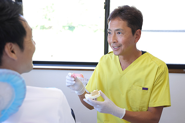 天然歯は汚れが付きにくく自浄作用もありますが、神経を抜いた歯や治療を繰り返す歯には限界があり、歯の質が弱くなってしまいます。当院ではむし歯になってしまったらまずは痛みを取り除き、原因を患者さんと一緒に考えて、ご自身の歯が残るような方針としています。そのため、歯をなるべく抜かない・削らない・痛くない治療を心がけています。