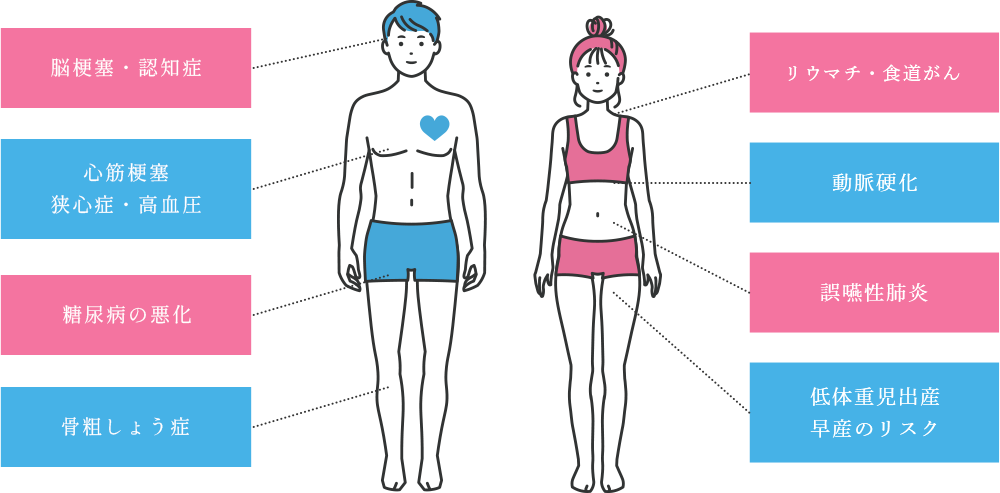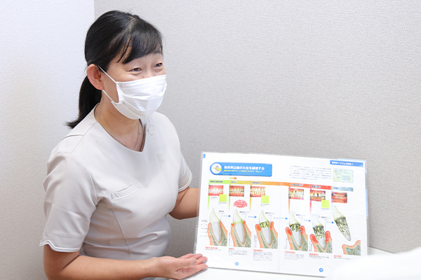 歯周ポケットに溜まった歯垢や歯石に含まれる細菌が原因となり、歯周病は発症します。歯周病は初期段階では痛みなどの自覚症状がほとんどありませんが、重度の場合は歯を支える骨を溶かし、歯周組織も壊してしまうため、歯はやがて抜けてしまいます。歯周病を防ぐためには予防・早期発見・早期治療がとても大切です。